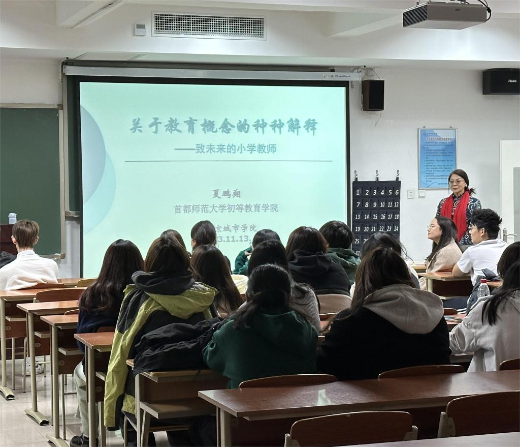 11月13日,文传学部2023级小学教育(贯通)专业在航天城校区举办教育专业导论系列主题讲座。本次活动特邀首都师范大学初等教育学院夏鹏翔教授进行题为“关于教育概念的种种解释——致未来的小学教师”的专题讲座。