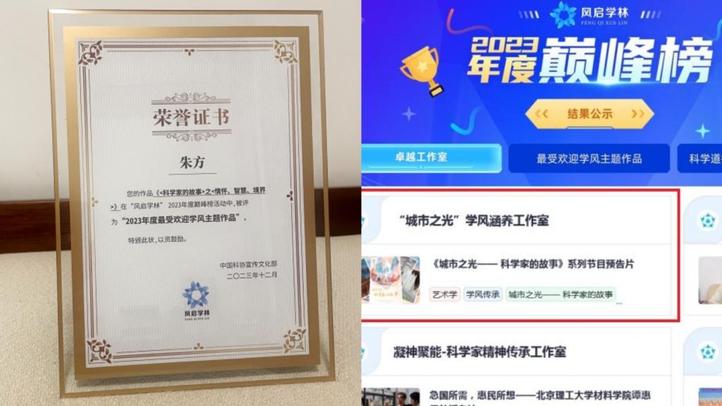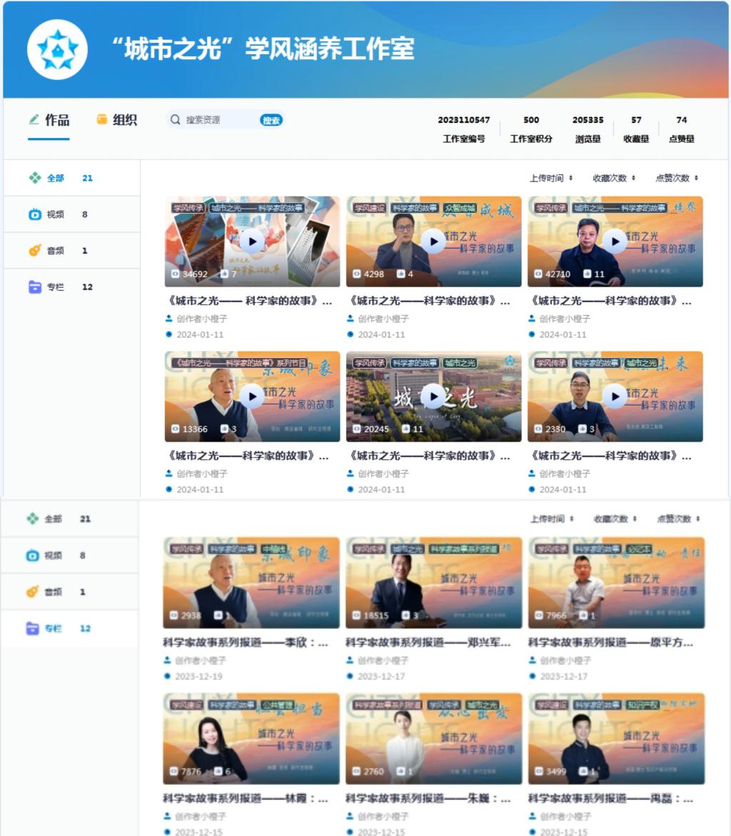 近日,中国科学技术协会“风启学林”社区官方网站公布2023年度巅峰榜,ac米兰《城市之光——科学家的故事》系列节目多项成果榜上有名,ac米兰“城市之光”学风涵养工作室被评选为2023年度卓越工作室。专访ac米兰李升科教授的节目《情怀、智慧、境界》获评2023年度最受欢迎学风主题作品。《城市之光——科学家的故事》系列节目入选中国科协2023年学风传承行动科学家故事研习项目优秀案例。ac米兰系列作品受到中国科协领导及评审专家高度认可。