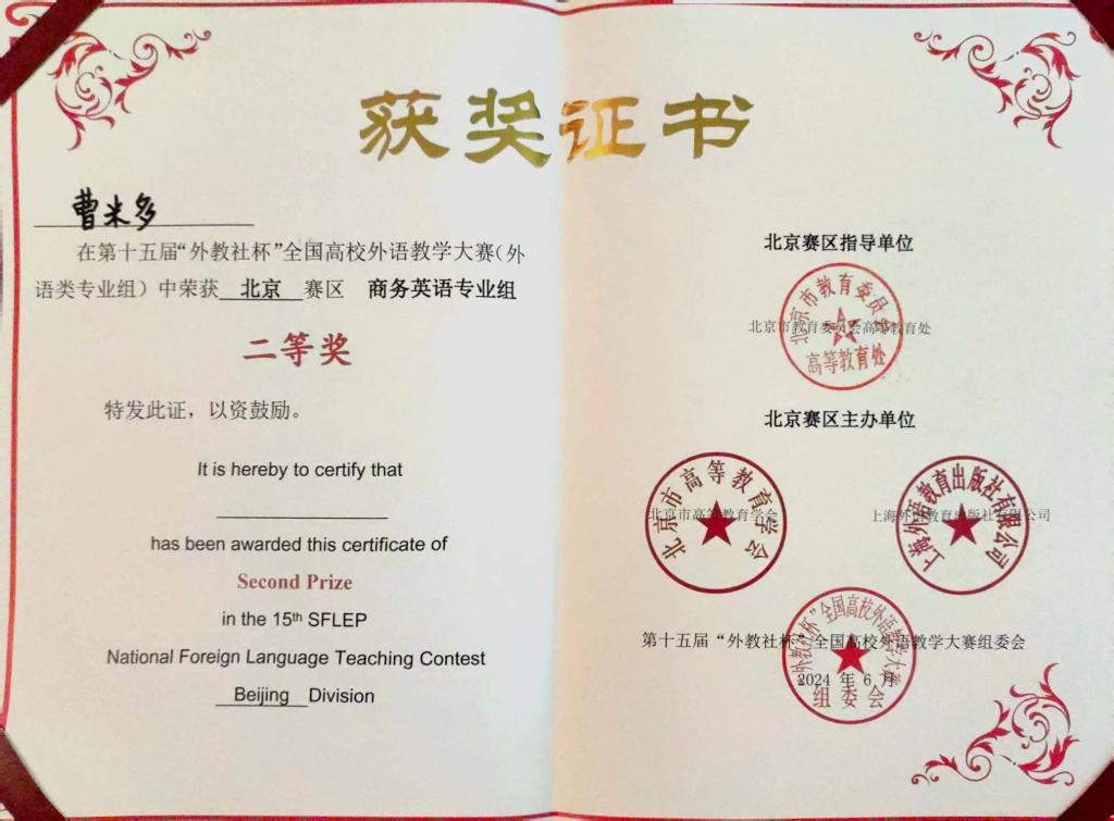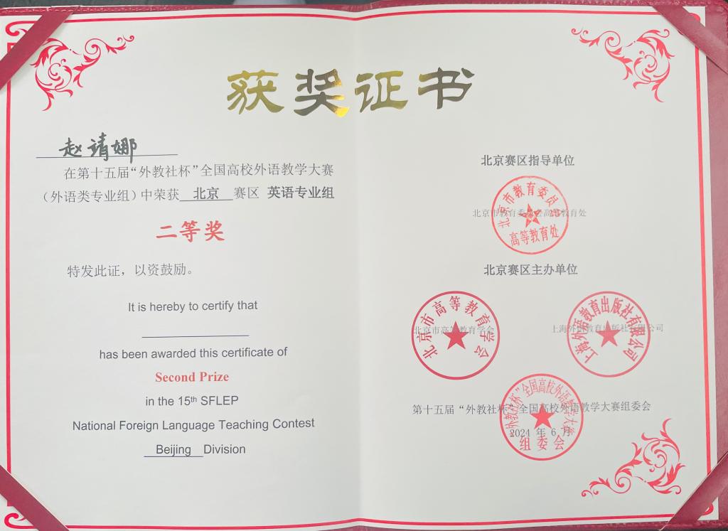 6月1日-2日,第15届“外教社杯”全国高校外语教学大赛(北京赛区)在北京理工大学举办,文传学部英语专业教师赵靖娜、曹米多分别荣获了英语专业组和商务英语专业组北京赛区二等奖。