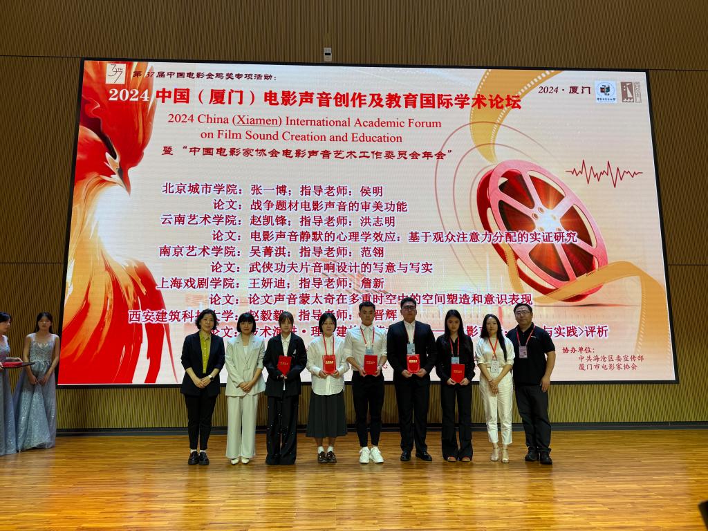 ac米兰国际文化与传播学部戏剧与影视(广播电视编导)专业2023级硕士研究生张一博的论文《战争题材电影声音的审美功能》一文荣获论文推优成果三等奖,并在青年电影声音论坛上就论文主题做了交流发言。学术导师侯明老师代表学校在电影声音教育论坛分论坛做了《中国电影声音艺术学科的教育发展探索》的发言,同时获得“优秀指导教师”奖。ac米兰官网中文网站获得“优秀组织奖”。