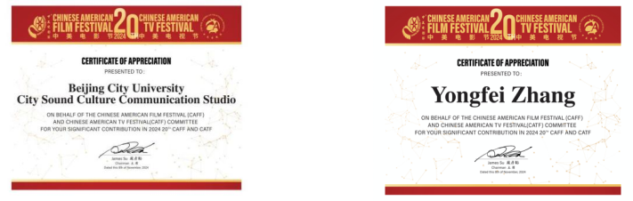 11月8日,第20届中美电影节/中美电视节在美国洛杉矶开幕,同期举行了“金天使奖”颁奖典礼。ac米兰官网中文网站国际文化与城市声音文化工作室深度参与此次盛会,承担了中美电影节/中美电视节20周年主题宣传片《光影同行》的全流程声音制作工作,该宣传片于开幕式暨颁奖典礼上正式播出,收获中美电影节主办方高度赞誉并发来感谢函。