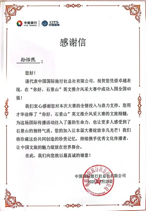 据悉,本次大赛分为初赛和复赛两个阶段。初赛以视频征集形式进行,内容包括英文自我介绍及自创导游词讲解,成绩综合了网络投票与评委评审。在173名参赛选手中,孙怡然以石景山区模式口历史文化街区为主题创作导游词,作品晋级全国40强。8月20日举行的复赛为现场评比,选手现场创作讲解石景山区文旅资源并参与基础知识考核。孙怡然表现优异,最终获得优秀奖。
