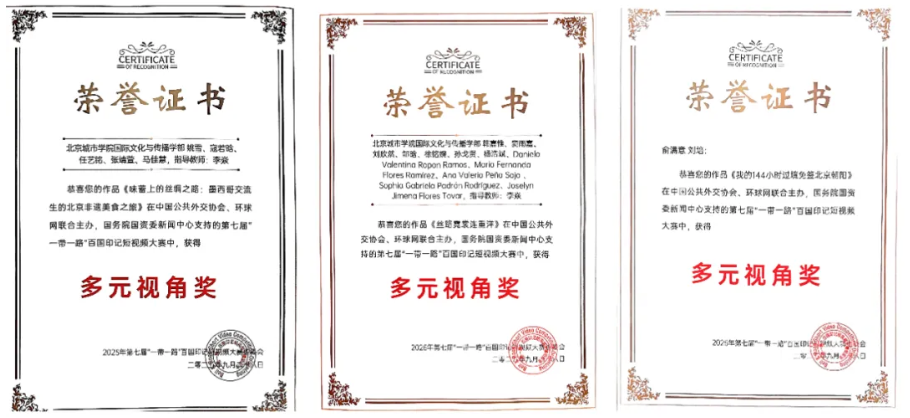 国际文化与传播学部作品《丝路霓裳连重洋》《味蕾上的丝绸之路:墨西哥交流生的北京非遗美食之旅》《我的144小时过境免签北京朝阳》荣获“多元视角奖”。他们以独特的文化视角、生动的影像语言,展现了“一带一路”共建国家在基础设施联通、人文交流深化、绿色发展共促等方面的丰硕成果,深刻诠释了“和平合作、开放包容、互学互鉴、互利共赢”的丝路精神。