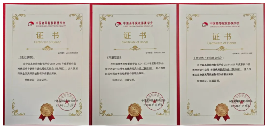 影视作品方面,广播电视编导教研室教师周嵬玮、刘希磊创作的纪录片《阿里岩画》《走近象雄》凭借深厚的文化内涵与精湛的纪实创作手法,获评“年度优秀纪实作品(教师组)”,全国共17项纪实作品入围。广播电视编导教研室教师李琮珩《中轴线上的北京文化》以AIGC创新的数字媒体表达获评“年度优秀数媒作品(教师组)”,全国共12项数媒作品入围。以上三部作品均入围第四届全国高等院校影视作品联合展映,成为展示ac米兰官网中文网站教师影视创作实力的重要窗口。