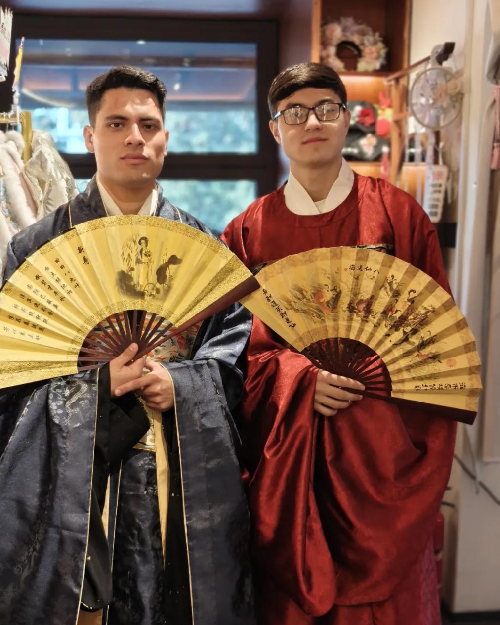 乌兹别克斯坦留学生Togaynazarov Sardorbek穿上朝臣礼服后,瞬间成为“古风少年”。他仔细触摸衣襟上的刺绣纹样,聆听中国学生讲述的“上衣下裳”的形制理念与“天人合一”的文化哲学。墨西哥学生Osvaldo Orozco赞叹道:“就像从壁画里走出来一样,原来中国古代服饰这么有设计感!”