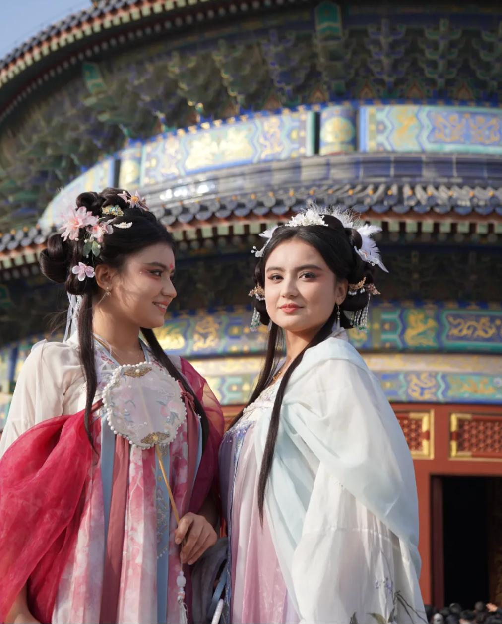 “乌兹别克斯坦的传统服饰也有刺绣和配饰元素,但汉服的剪裁和文化寓意更独特。”Togaynazarov Sardorbek表示,这次体验让他感受到中华传统文化的细腻与厚重,回去后要和朋友们分享这份特别的“文化礼物”。“转身就能望见天坛祈年殿的飞檐,身上穿的是千年前的汉服,这种穿越时空的感觉太奇妙了!”来自乌兹别克斯坦的Fotima Allamurodova兴奋地分享她的感受。Zuxra Allamurodova则表示:“天坛的宏伟和汉服的典雅太配了,这是我在中国最难忘的体验之一,以后还要穿着汉服去更多地方打卡。”