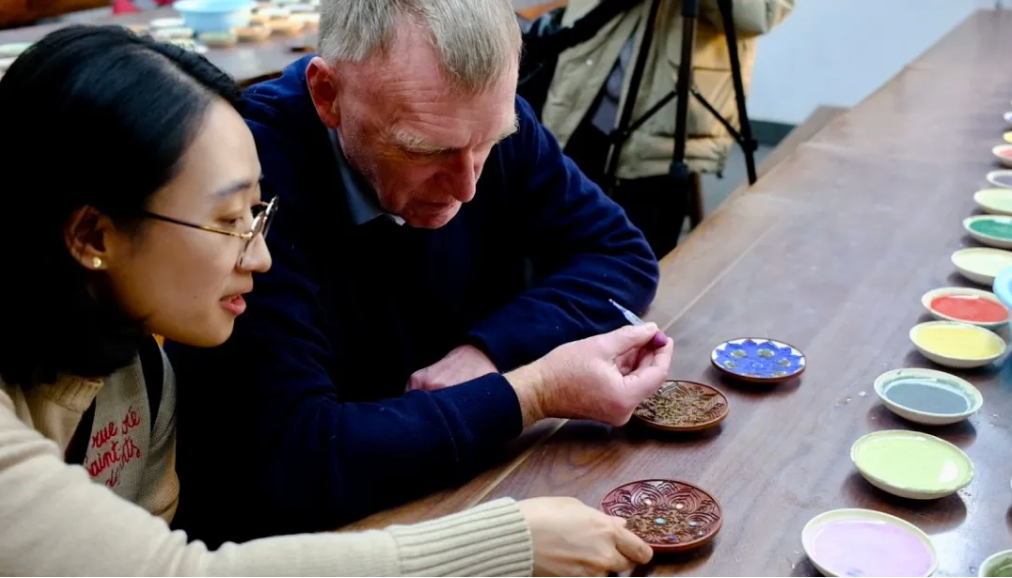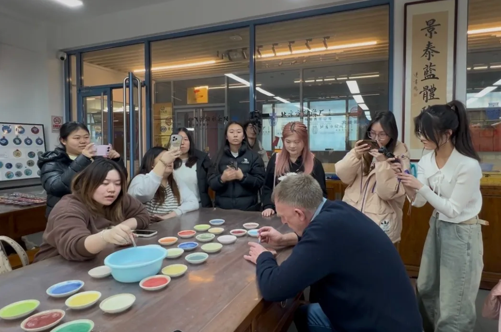 在博物馆内,师生们不仅欣赏了历代景泰蓝珍品,也系统了解了这项国家级非物质文化遗产的发展历程与艺术价值。为了进一步体会课堂上学到的知识,大家不仅近距离观看了工艺大师现场演示景泰蓝制作的关键流程,更在指导下亲手体验了“点蓝”这一核心工序,深刻体会到传统技艺的精湛与匠心。