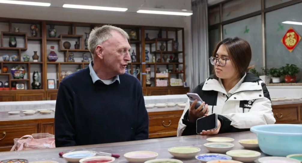 学生们运用所学知识,以小组协作的形式,以讲好景泰蓝故事为目标,用中德双语对展品与工艺进行讲解、拍摄与访谈。德国外教全程参与,与学生进行交流,接受学生采访。学生们在本次实践中实现了语言应用、翻译实践与跨文化交际能力的综合锻炼。