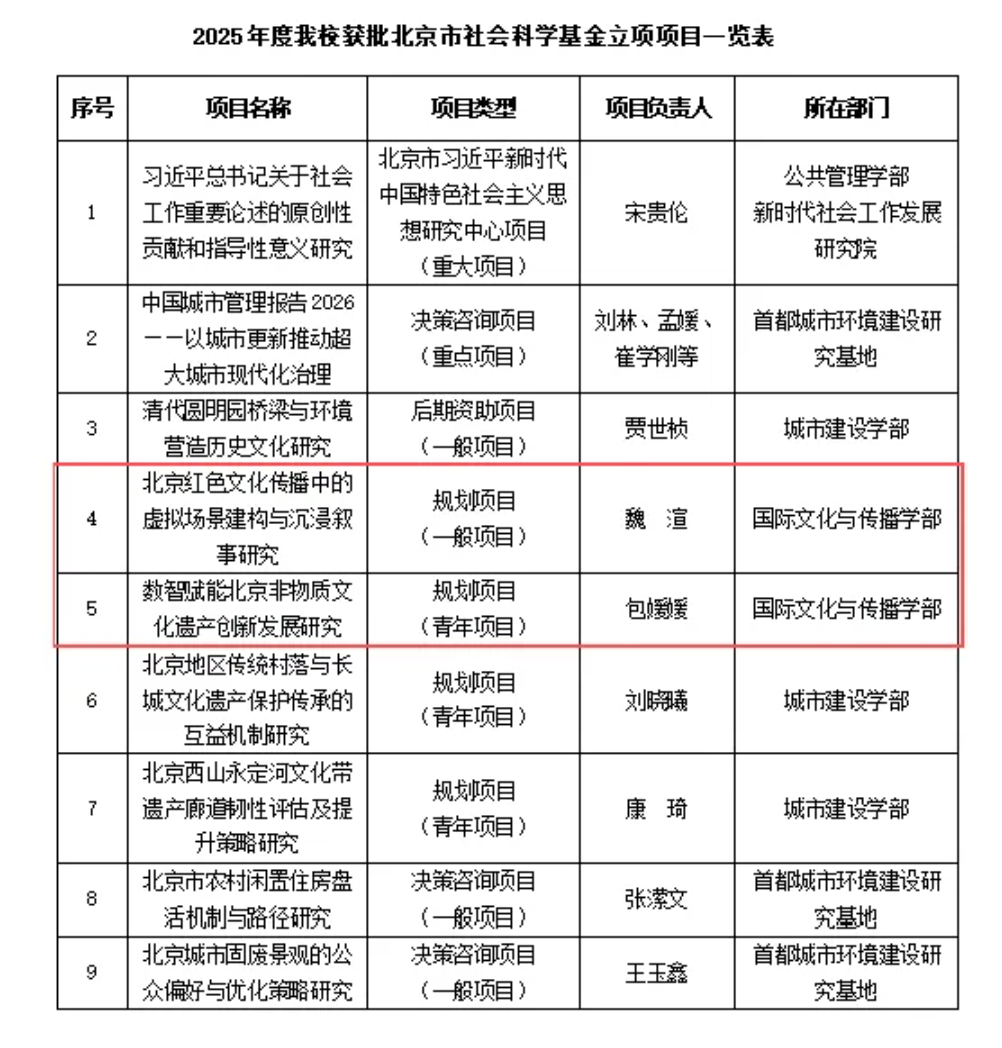近年来,国际文化与传播学部始终以学科建设为核心,提前布局数智传播、城市文化、红色传承等重点研究方向,持续强化科研团队培育,不断完善项目申报全流程指导机制——通过专题培训、专家会诊、跨学科协作等多元举措,系统性提升教师申报质量与科研能力。此次项目获批,不仅为学科建设注入强劲动力,更将为学校高水平科研平台搭建、首都区域文化高质量发展及对外传播能力提升贡献力量。