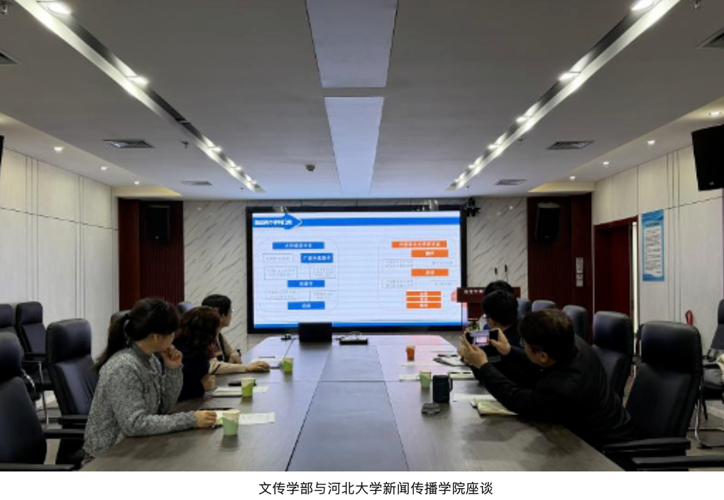 河北大学新闻传播学院党委书记滑晓军、副院长商建辉和白树亮,河北经贸大学新闻与文化传播学院院长景义新、副院长马兴祥和田悦芳等相关负责人分别介绍学院的发展历程、学科专业布局、师资结构及人才培养与学科建设等方面的主要成果。李嘉懿详细介绍了文传学部的办学定位与专业特色,重点分享了学部在人才培养、应用型科学研究、社会服务及国际合作等方面的实践经验。