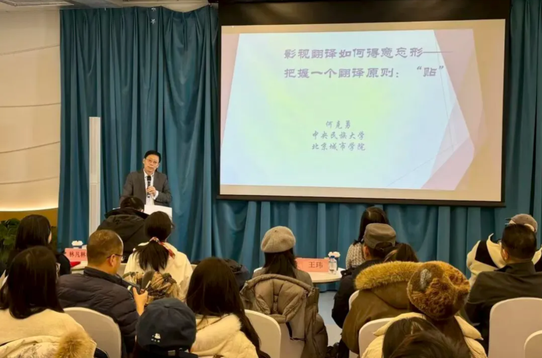 本次活动以“翻译,让影像跨越边界”为主题,汇聚了来自学界与业界的专家代表。何克勇教授以《影视翻译如何得意忘形——把握一个翻译原则:“贴”》为题,以杨绛、林语堂等翻译大家的经典译文为例,生动阐释了翻译为何要做到“贴”,同时列举了大量影视翻译作品中存在的问题,给出了更加“贴合”的译文,指出影视语言需要贴合具体语境、人物身份与影像节奏,在动态对等中追求“神似”,需要更好实现跨文化语境下的有效传播。