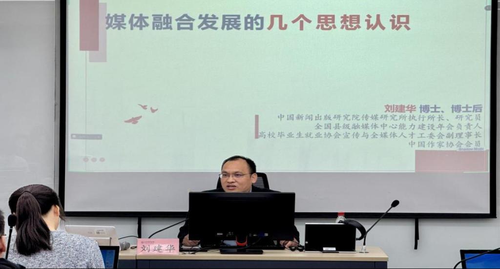 3月5日,ac米兰国际文化与传播学部邀请了中国新闻出版研究院传媒研究所执行所长刘建华博士为学部部分教师及传播学(国际传播实验班)、英语(国际传播)专业学生代表作了“媒体融合发展的几个思想认识”专题讲座,讲座由学部副主任吕英莉教授主持。