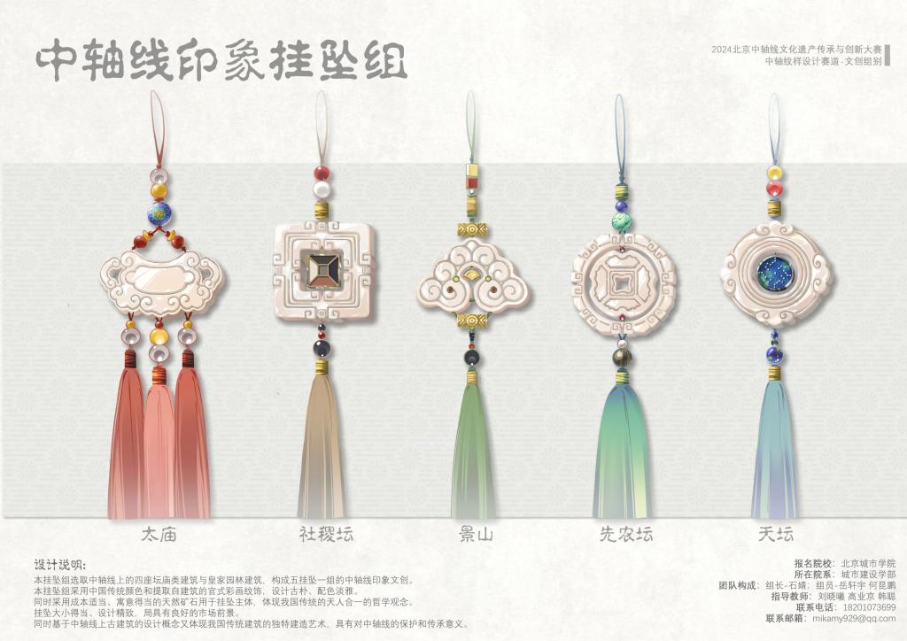 近日,“北京银行杯”2024北京中轴线文化遗产传承与创新大赛完美收官。城市建设学部学子取得优异成绩。2021建筑本2石婧、何昆鹏、2022造价本1岳轩宇(指导教师:刘晓曦 高业京 韩聪)参赛作品《中轴线印象挂坠组》获得中轴纹样赛道三等奖;2021传统建筑本杨扬、赵昭(指导教师:韩聪、高业京)参赛作品《遇见中轴线——祥云纹样设计与应用》获得中轴纹样赛道优秀奖。