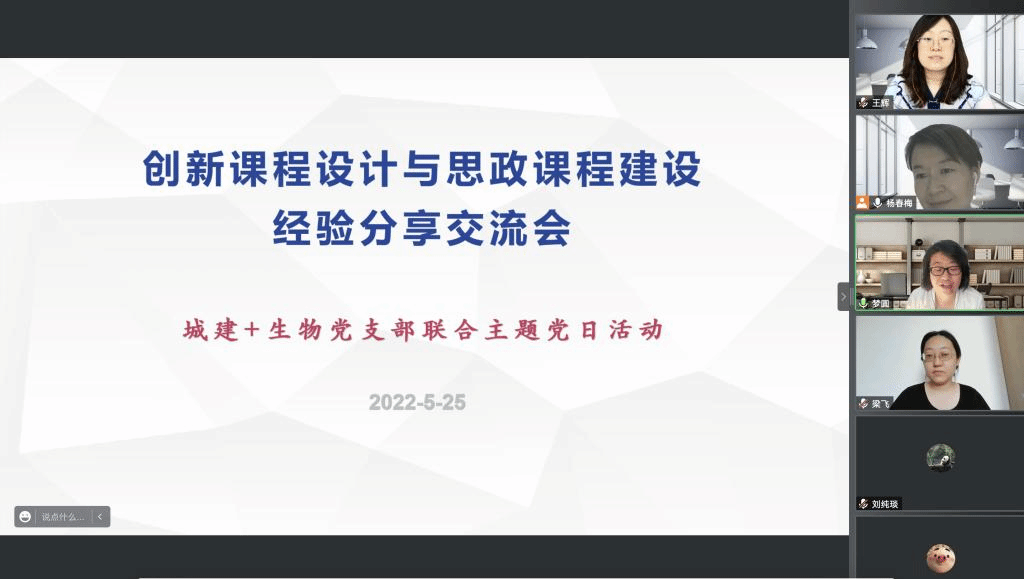 5月25日,生物医药学部与城市建设学部党支部利用腾讯会议线上平台开展创新课程设计与思政课程建设经验分享交流主题党日活动。此次活动由生物医药学部党支部书记杨春梅主持,两个学部的全体教师参与其中。