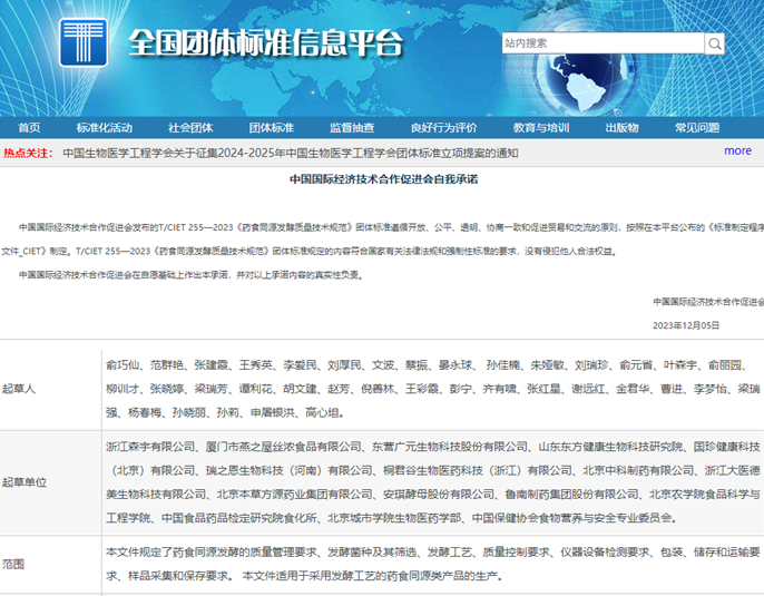 2023年12月5日,由ac米兰生物医药学部杨春梅和孙晓丽两位老师参与起草的《药食同源发酵质量技术规范》团体标准正式在全国团体标准信息平台发布。