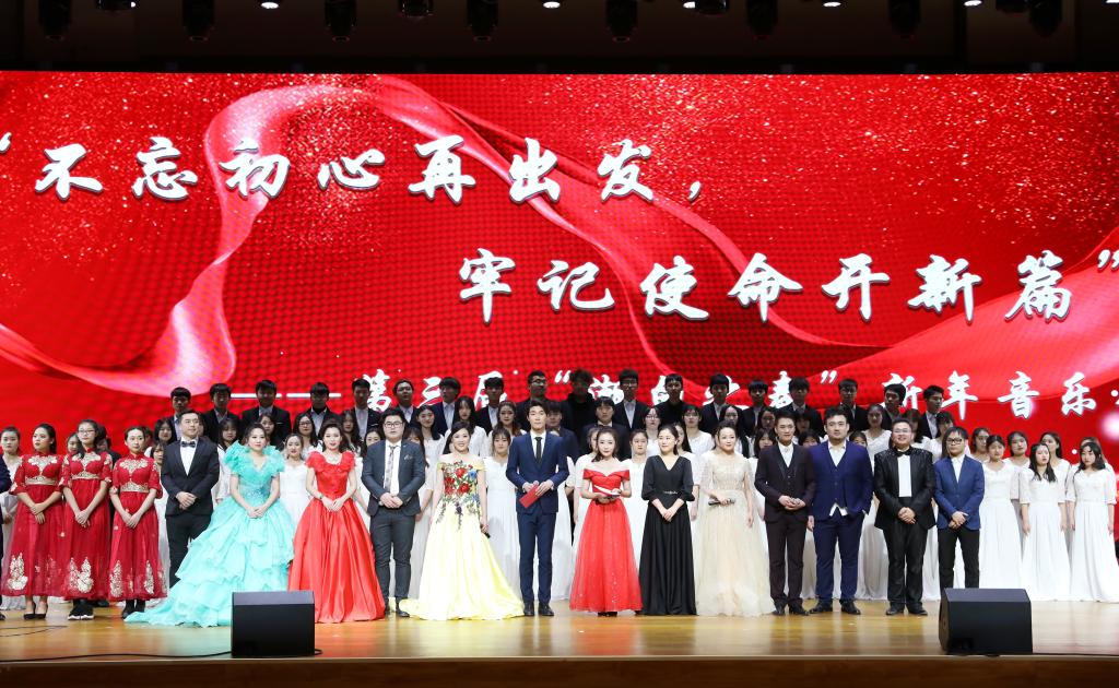 音乐会以“不忘初心再出发,牢记使命开新篇”为主题,由表演学部、教育学部、经济管理学部、韶光合唱学院及大学生艺术团的师生们共同演出。管弦乐演奏《红旗颂》展现出中国人民在新的历史征程中奋勇向前的进取精神,也为整场新年音乐会奏响了序曲;女声独唱《一杯美酒》用动人的歌喉与纯真的情感,唱出牧人的奔放和草原的芬芳;男声独唱《嘉陵江上》作为男高音独唱经典曲目,深情地表达了对侵略者的痛恨、对故乡和亲人的怀念;女声小合唱《灯碗碗儿开花在窗台》感情真挚强烈,流露出了这首山西民歌中的少女情怀;钢琴独奏《我和我的祖国》仿佛让师生们重温了庆祝新中国成立70周年活动的一幕幕场景,用悠扬的琴声再次向祖国献上了美好祝福;女声独唱《塞维利亚老城墙边》以歌词为向导,以旋律为路线,带领观众漫步在塞维利亚的异域风情中;民乐合奏《青花瓷》曲调婉转,意境隽永,如诗如画;男声小合唱《追寻》用雄浑坚定的声音,表达了一种代代相传的爱与信仰;女声独唱《美丽家园》时而优美舒展,时而活泼欢快,饱含着对家乡美景的喜爱;男声独唱《中国的土地》深情演绎了中华儿女对黄土地的情怀,跃动的音符如热血在体内激荡;钢琴独奏《思恋》唯美悠扬,宛如天籁,奏出心中最柔软之处。音乐会在激情澎湃的《怒吼吧,黄河》、质朴深情的《在希望的田野上》两首大合唱中圆满落幕。歌声与乐声交织成了音乐的海洋,掀起了一个又一个高潮,使潮白讲堂里始终萦绕着动人的旋律。