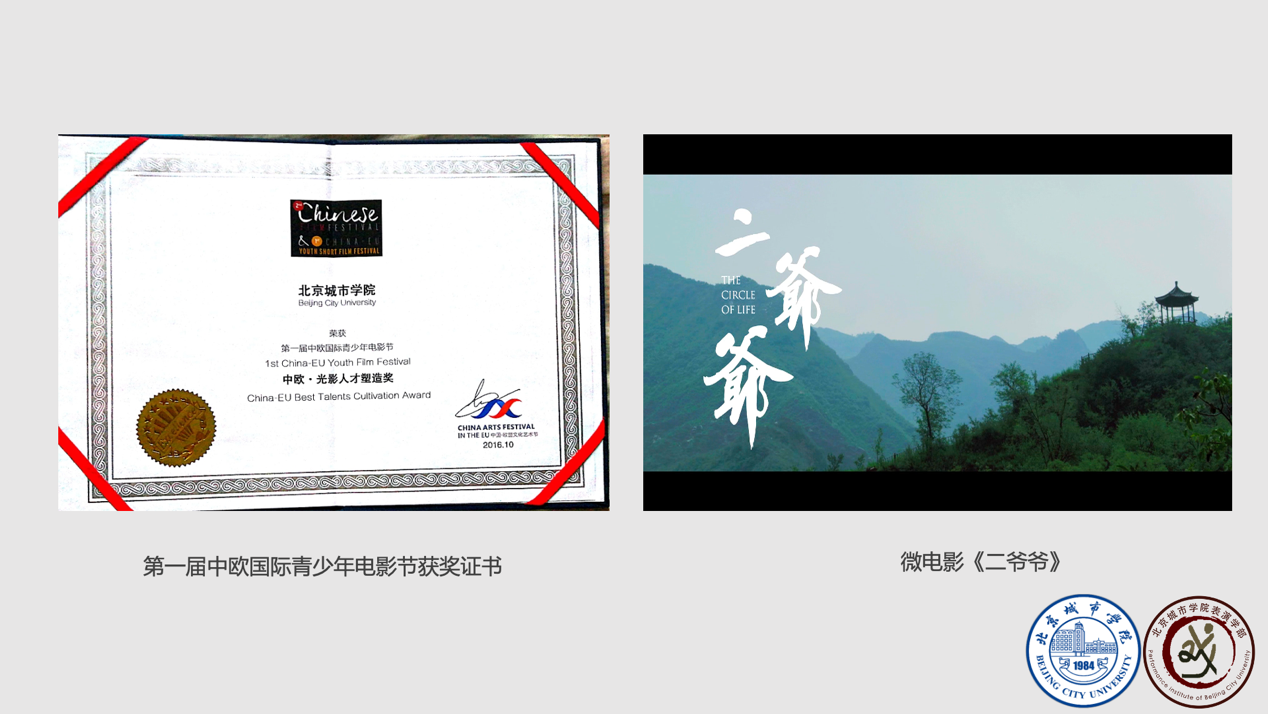 5、2016年微电影《二爷爷》荣获布鲁塞尔中欧青年影像大赛光影奖;荣获2017年第二届EZ.ART全国大学生影像大赛三等奖。