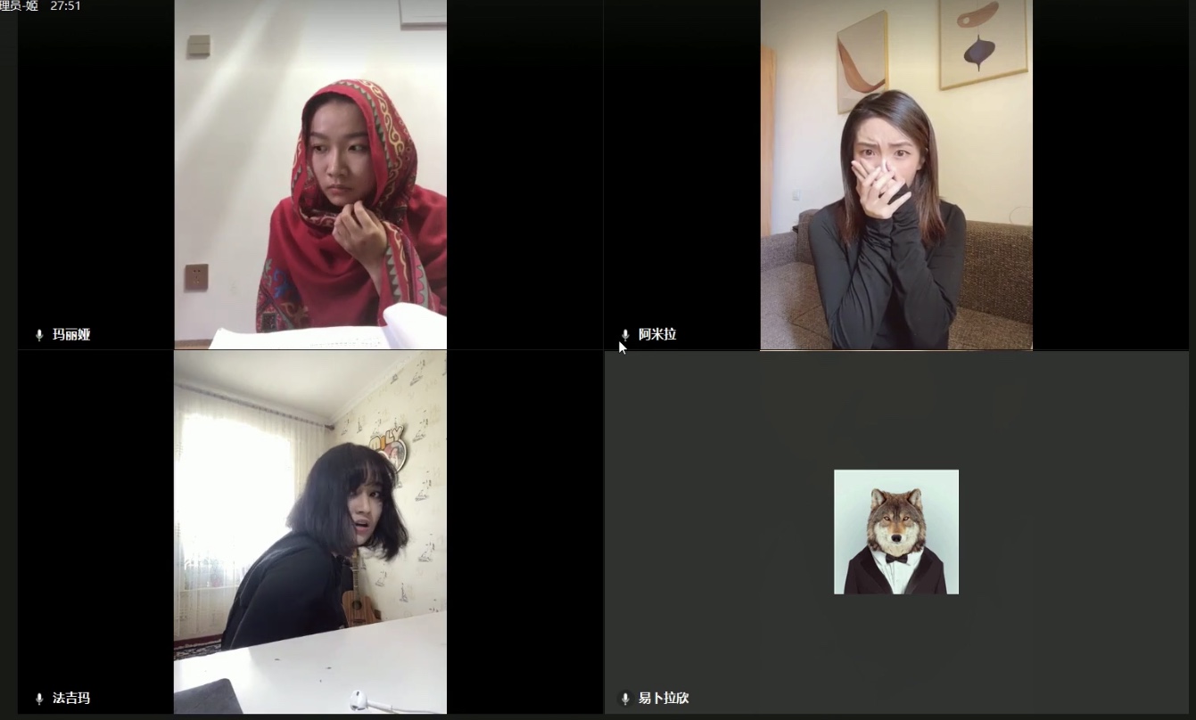 不同于录播形式的戏剧演出和常规的线上剧本朗读,此次的云上直播演出,需要学生运用各自的电子设备镜头,以“宫格”式样的图视效果集体呈现在屏幕上。每一位学生既是角色的扮演者又是所扮演角色的摄像师、化妆师、灯光师、音效师等。经过创造性编排这些“宫格”中的影像和声音,努力打破环境的隔阂,开启穿越空间和屏幕局限的“现场性戏剧表演”。