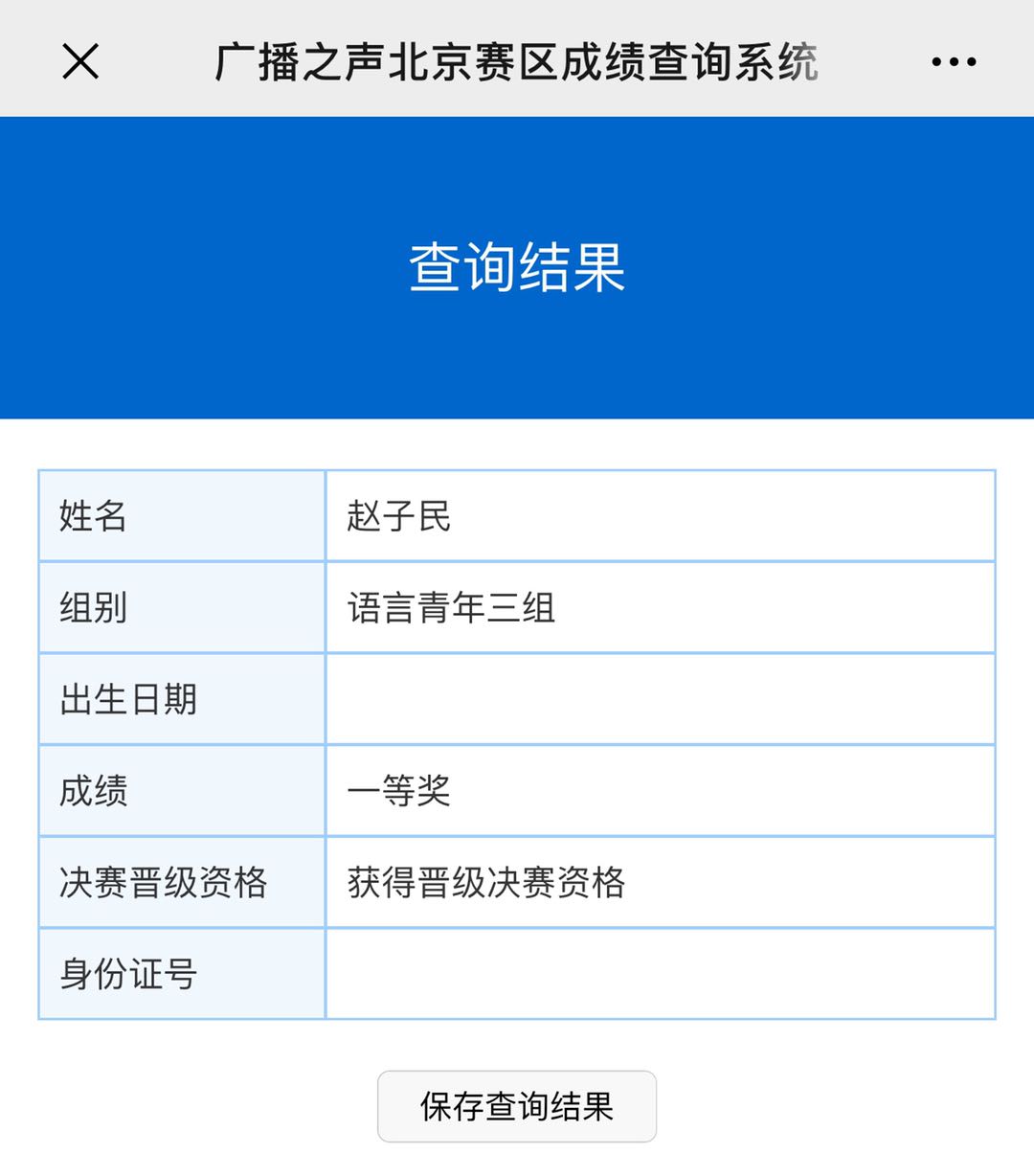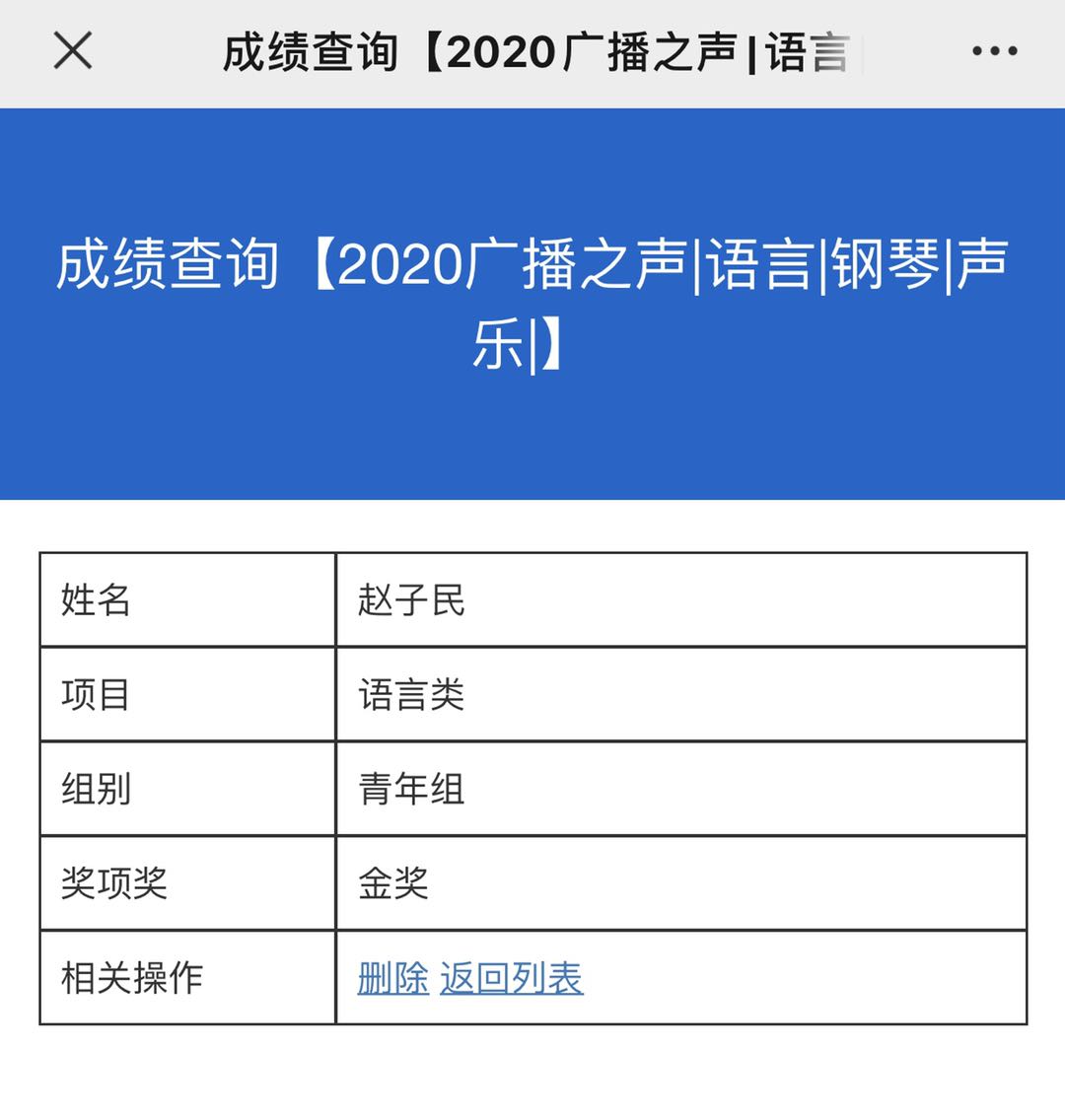 2019年12月底,赵子民同学荣获北京赛区语言类青年组一等奖,并晋级全国总决赛。2020年10月,“广播之声”2020全国青少年艺术大赛全国总决赛中,赵子民同学荣获语言类青年组金奖!