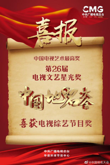 据悉,今年九月,《中国地名大会》(第一季)荣获第26届电视文艺“星光奖”,创办于1987年的“星光奖”,与中国电视剧“飞天奖”、中国电影“华表奖”并列为国家广电总局的三大政府奖,是中国电视艺术的最高奖项。