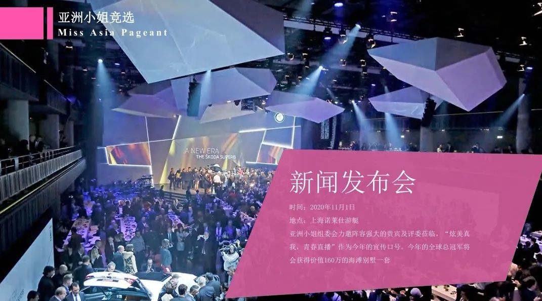 此次赛事已于2020年11月1日在上海诺莱仕游艇召开新闻发布会,亚洲小姐组委会力邀了阵容强大的嘉宾、评委莅临现场,以“炫美真我,青春直播”为口号,引入淘宝直播、抖音、快手、花椒等直播平台,现场将覆盖尽30万场内外观众。参与赛事的选手也具备品牌形象代言优选权和覆盖线上线下的强势广告宣传。