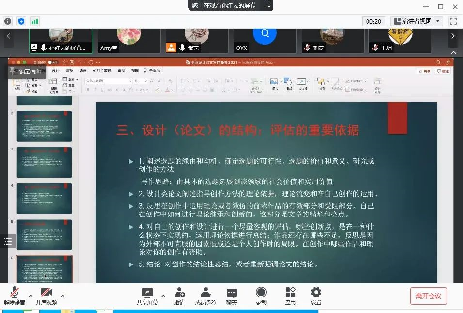 孙红云教授以选题出发,从选题的前期调研、进行创作或研究现状综述、如何确定有兴趣有价值的选题这三个方面展开讲解;又从创作或设计过程的跟踪到设计的结构,来阐述如何帮助学生走出迷茫期,如何启发学生从中找到解决问题的方法,反思在创作中运用的理论依据;并对致谢、参考文献、附录等论文结构提出了指导要求。