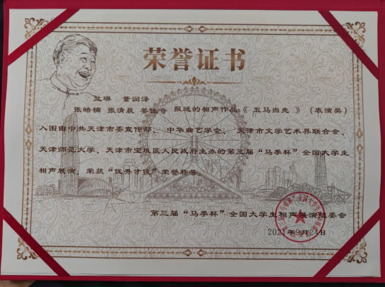 收到证书的那一瞬间,一下子涌起很多情绪,惊讶,喜悦,感动,如释重负,但更多的是感恩。作为曲艺班最小的一届学生,能取得这样的成绩,需要老师们付出很多的心血,从定稿改稿,到排练录制,老师们一直在背后给我们最大力的支持,无论半夜几点,发出去的消息永远第一时间得到回复,通宵排练更是家常便饭,小到一个重音,大到每个调度,一点一滴都包含了老师们的付出与努力。在校排练期间,也少不了师哥师姐的帮助,他们在用自己的方式帮助第一次参加比赛的我们缓解压力,真正的做到劳逸结合,没有明争暗斗,只有互帮互助,让我深刻的理解了团队与团体荣誉的意义。所以证书上的名字虽然只有两个人,但功劳属于大家,荣誉属于集体,感谢每一个人的支持和帮助。