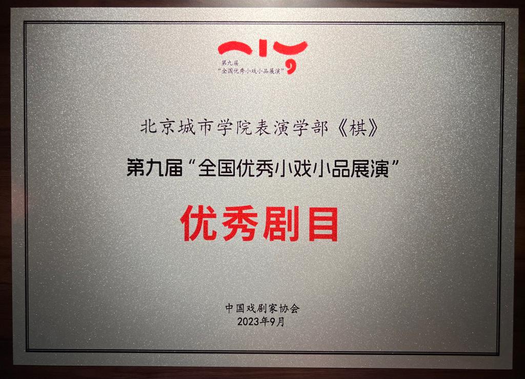 近日,表演学部教师团队李鹏(导演)、苏娜(编剧、导演)、张众欢(灯光设计)、周原申(音乐音响)共同完成的话剧小品《棋》获第九届“全国优秀小戏小品展演”优秀剧目奖,该剧目演员均来自于2020级北城启泰表演定制班大四学生。