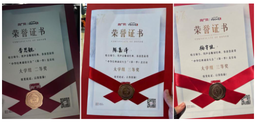 “中华经典诵读大会”(第一季)是2023年央广网特别策划推出的大型文化展演活动,自展演启动线上征集以来,全市众多朗诵艺术爱好者踊跃报名参加,共有2439人参与。经过组委会组织相关专家进行初选、终选等多轮评审,有216名选手脱颖而出。表演学部播音与主持艺术专业2023级学生李思靓获得大学组二等奖,2021级学生杨宇佳、2020级学生陈嘉泽获得大学组三等奖。