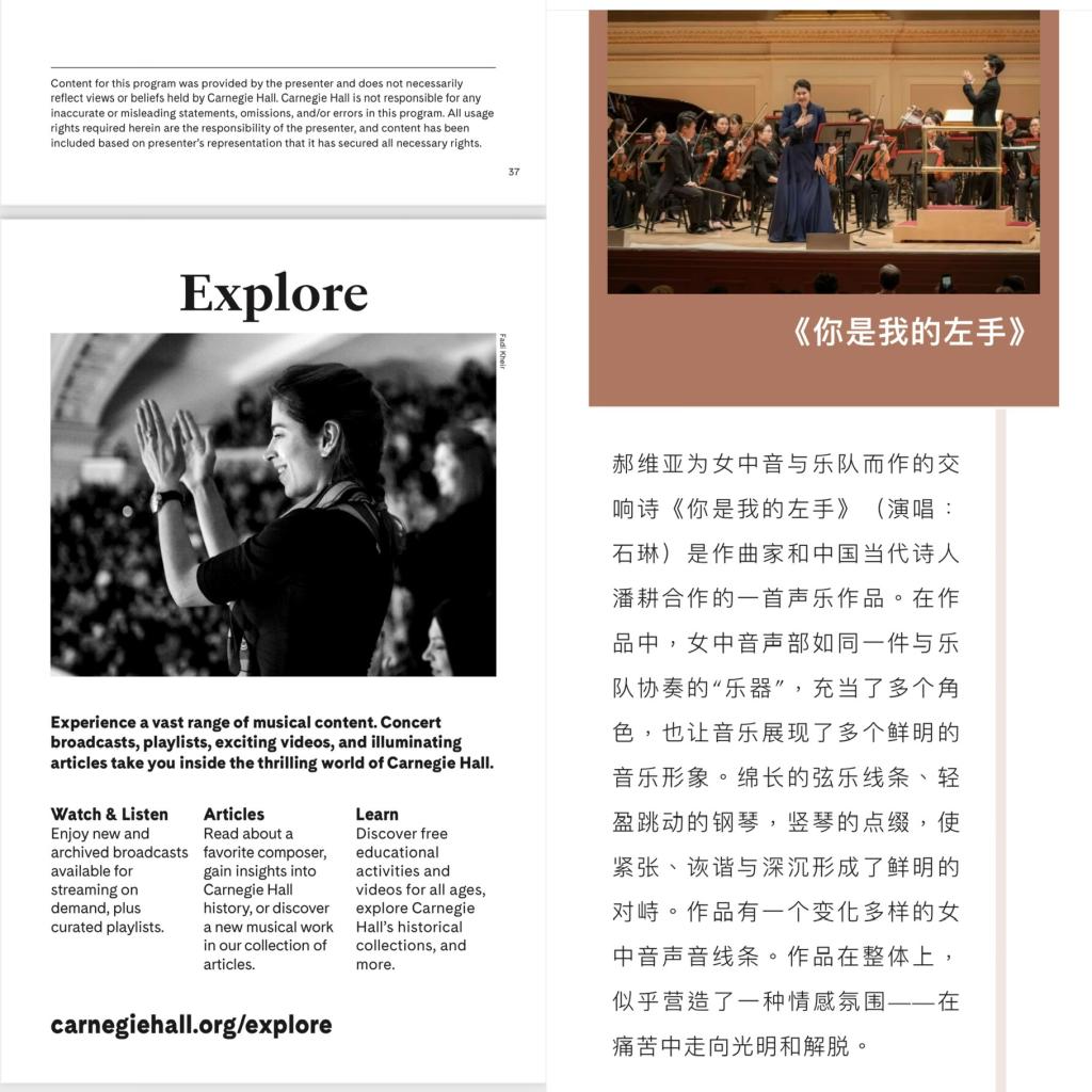交响曲《你是我的左手》的诗作是潘耕原创发表的一首当代长诗,作曲为中国著名作曲家、中央音乐学院作曲系主任、博导郝维亚教授,诗歌交响曲由我国青年女中音歌唱家石琳用中文演唱。此次合作体现了中国当代诗歌与当代作曲的结合与碰撞。音乐会演出信息和诗作的英文版登载于百老汇官方演出场刊《PLAYBILL》。