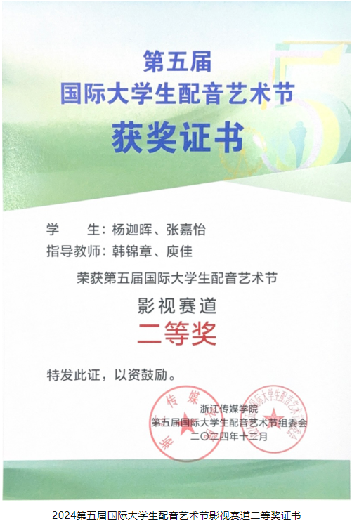 近日,由中国高等院校影视学会指导,浙江传媒学院、爱奇艺主办的2024第五届国际大学生配音艺术节获奖证书公布。此次比赛共有412所院校提交的13760件作品,经过激烈角逐,ac米兰表演学部播音与主持艺术专业学生喜获佳绩,影视配音组杨迦晖、张嘉怡获得影视赛道全国二等奖。