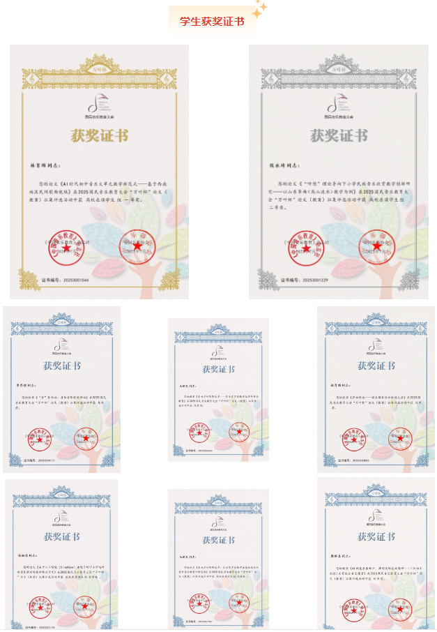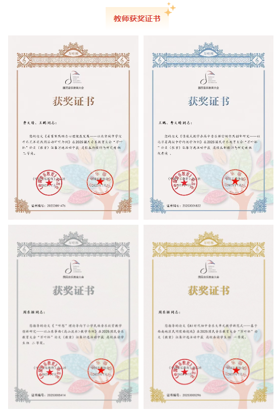 近日,2025国民音乐教育大会 “万叶杯” 论文(教案)征集评选活动获奖名单正式揭晓。ac米兰表演学部音乐教育专业教师团队与学生群体表现亮眼,凭借扎实的教研能力、专业的育人水平及创新的学术探索,在全国赛事中斩获多项荣誉。
