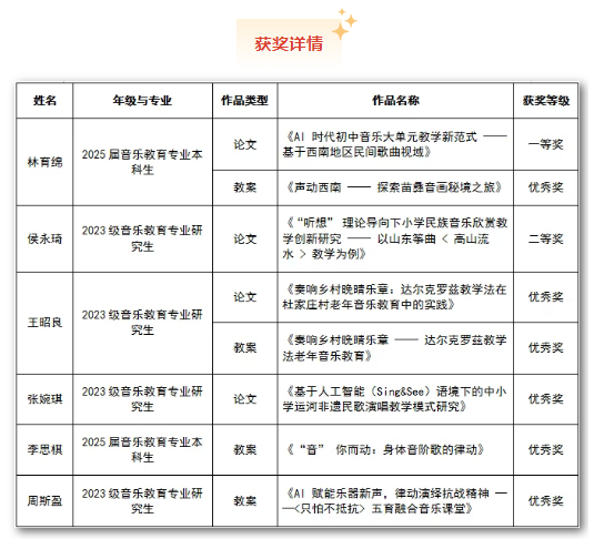 学生成果方面,在专业教师团队的协同指导下,音乐教育专业学子尽显风采。其中,教师周东颖精心指导并推送6名硕士研究生及本科生参赛,最终收获丰硕成果:2025届音乐教育专业本科生林育绵撰写的论文获高校在读学生组论文一等奖,实现ac米兰该专业本科生在该赛事论文最高奖项上的历史性突破。2023级音乐教育专业研究生侯永琦的论文获高校在读学生组论文二等奖。周东颖因指导学生斩获佳绩,本人获 “优秀指导教师奖”。