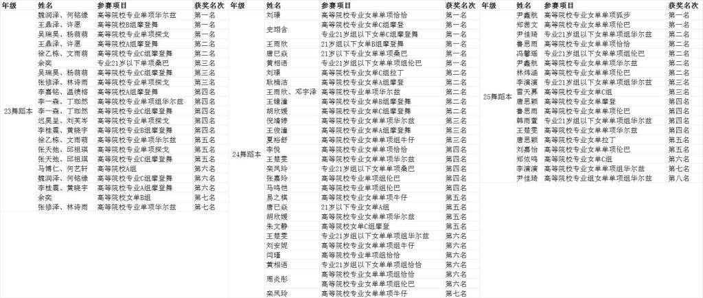 本次赛事,表演学部舞蹈表演(国际标准舞)专业学生共参与90人,参赛组别包括青年组摩登、青年新星拉丁高等院校女单等,经过两天的激烈角逐,学生们凭借出色表现与精湛舞技斩获优异成绩,共获得包含冠亚季军等80余奖项。获奖情况如下: