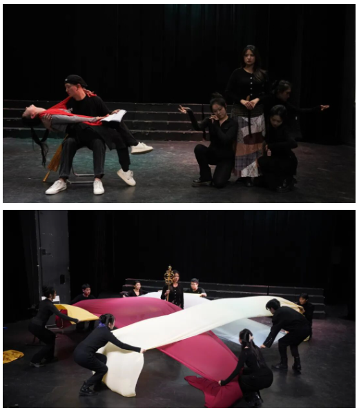 演出当晚,由表演学部学生组成的“歌队”构成了全剧的风格化基石。他们游走于观众与舞台的边界,时而是涌动的内心外化,时而仅仅依靠简单的绸缎道具和扎实的肢体表现力,用“身”与“心”的配合营造出家、寺庙、西湖乃至洪水滔天的多重戏剧空间,展现了学生们过硬的专业功底与团队协作精神。