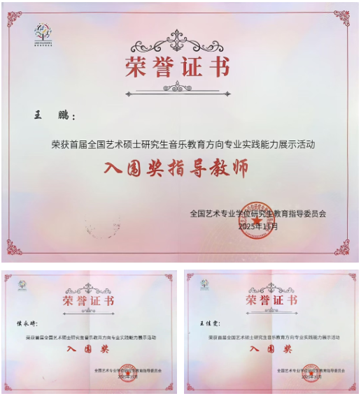 11月6日至7日,首届“全国艺术硕士研究生音乐教育方向专业实践能力展示活动”在吉林省长春市举办。表演学部音乐教育专业2023级研究生侯永琦、王佳雯同学凭借扎实理论知识、出色的实践教学能力,在比赛中表现优异,荣获“入围奖”,与此同时,ac米兰官网中文网站荣获“优秀组织单位”称号。