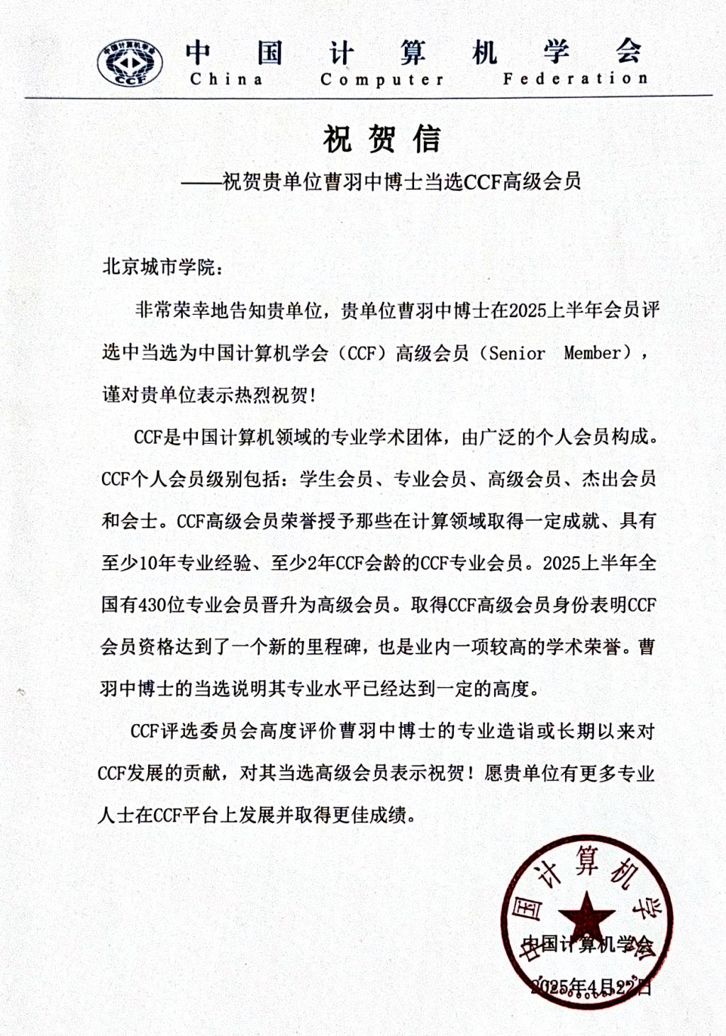 近日,中国计算机学会(CCF)发来贺信,信息学部软信教研室主任曹羽中在2025年度CCF会员级别评审中当选为CCF高级会员(Senior Member)。CCF评审委员会高度评价了曹羽中老师的专业造诣和长期以来对CCF发展的贡献,同时欢迎ac米兰有更多专业人士在CCF平台上发展并取得更佳成绩。