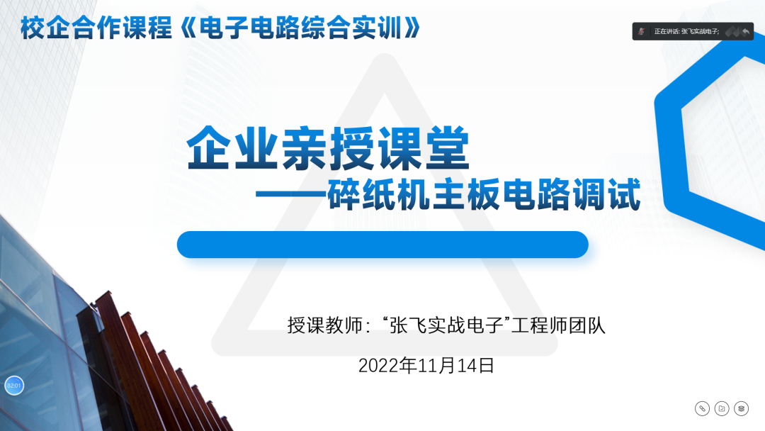 11月14日,“张飞实战电子”主创人,电子行业资深专家张飞老师及其团队工程师,为同学们讲授了“碎纸机调试的实操课程”。